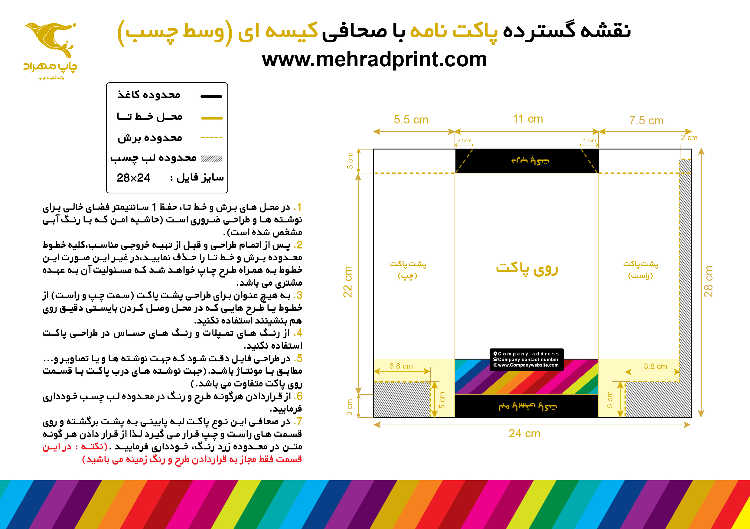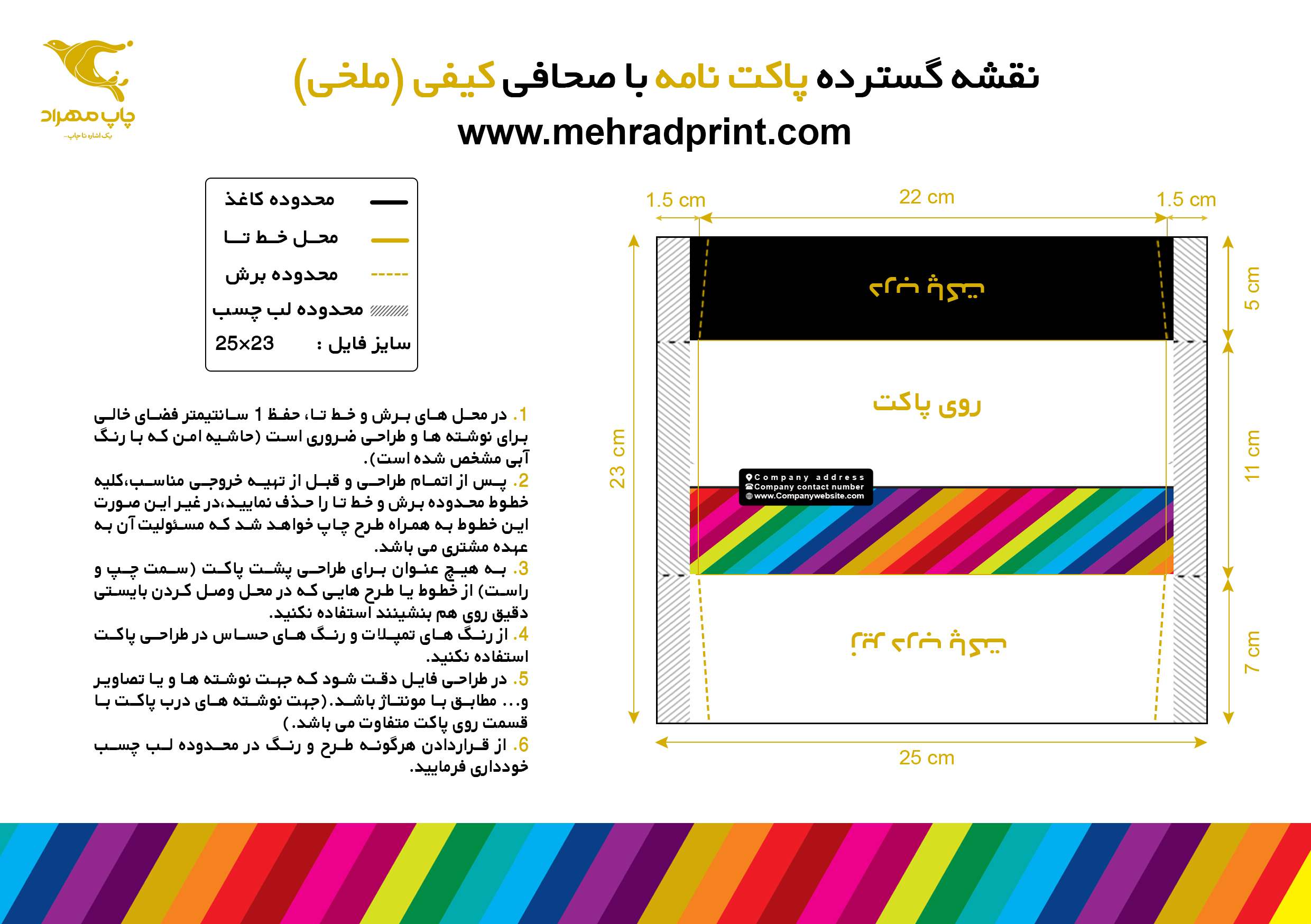 6. در طراحی فایل دقت شود که جهت نوشته ها و یا تصاویر و... مطابق با مونتاژ باشد.(جهت نوشته های درب و زیر درب پاکت با قسمت روی پاکت متفاوت می باشد.)