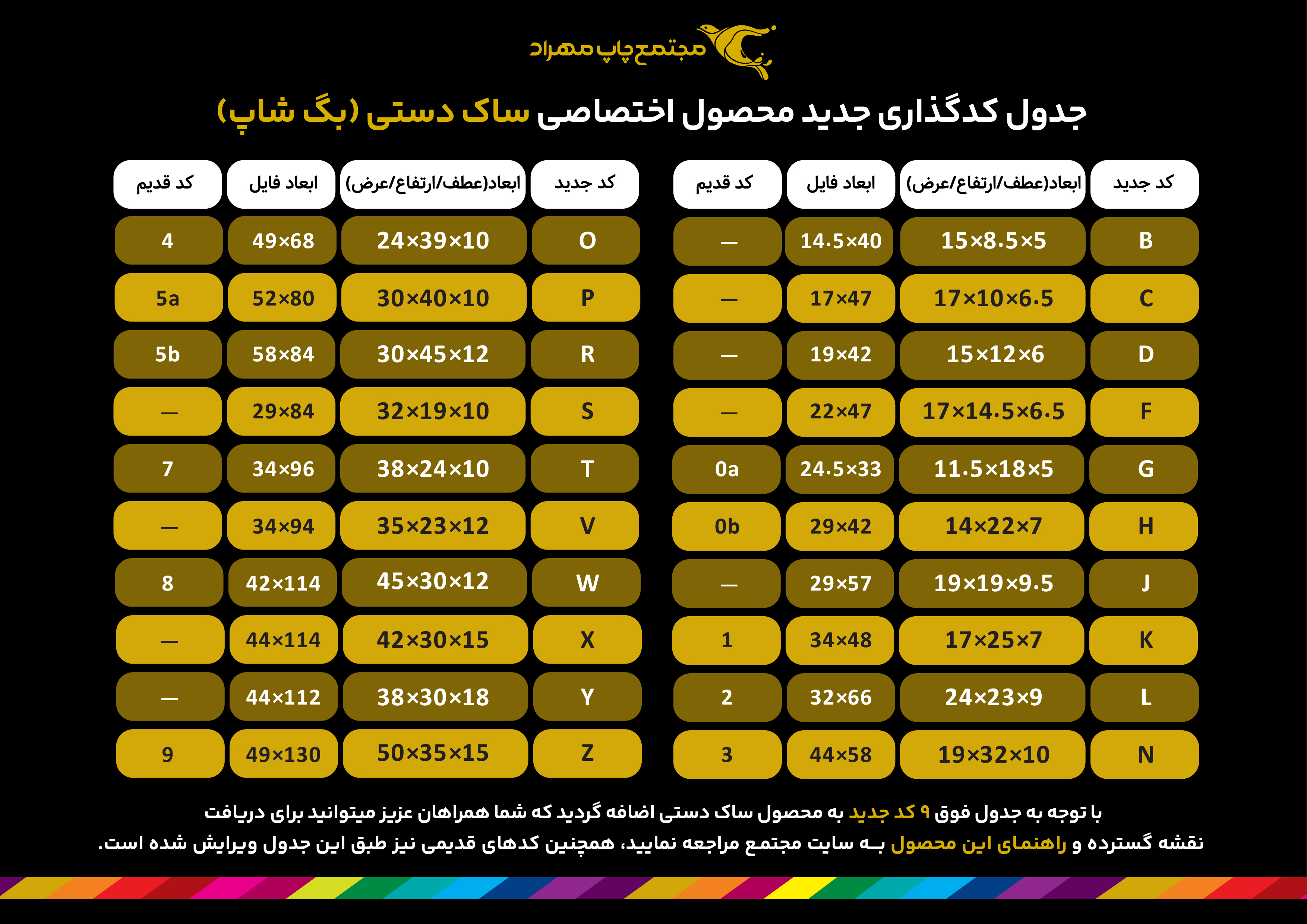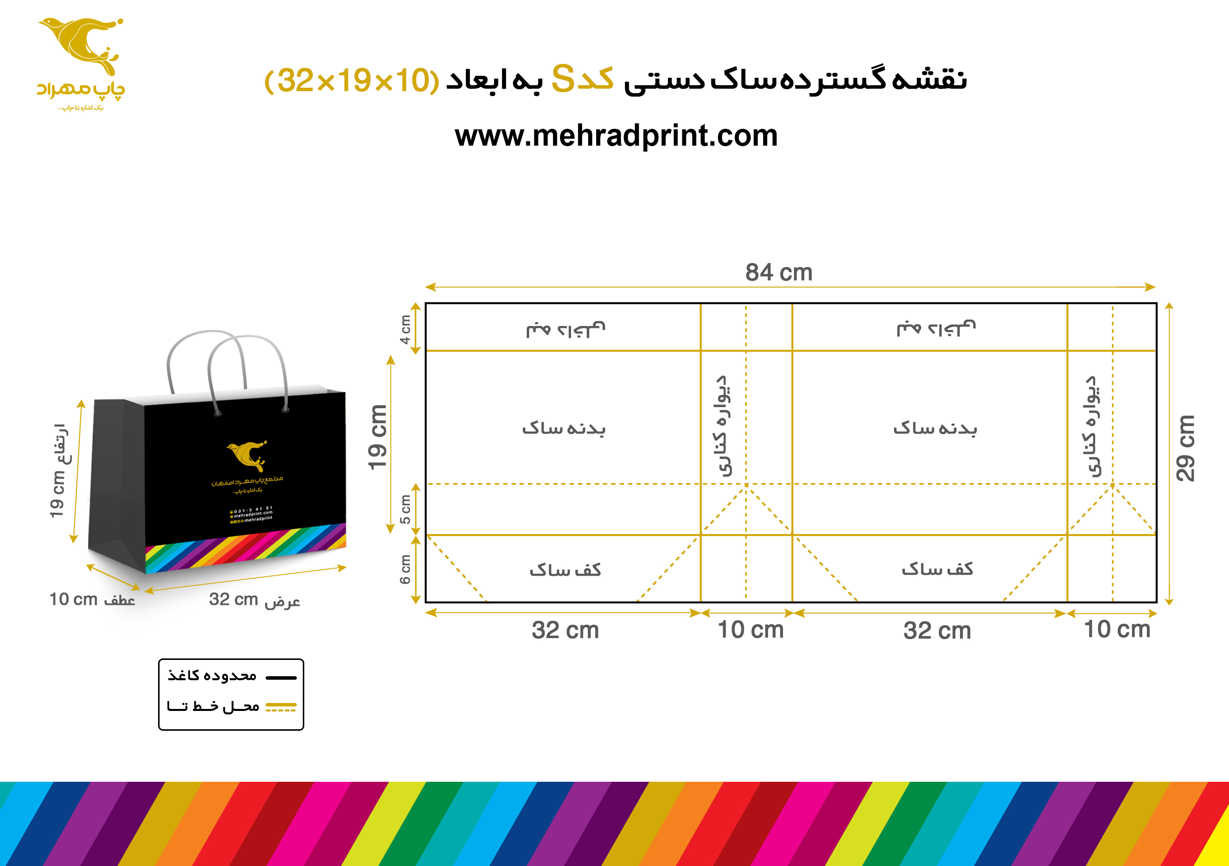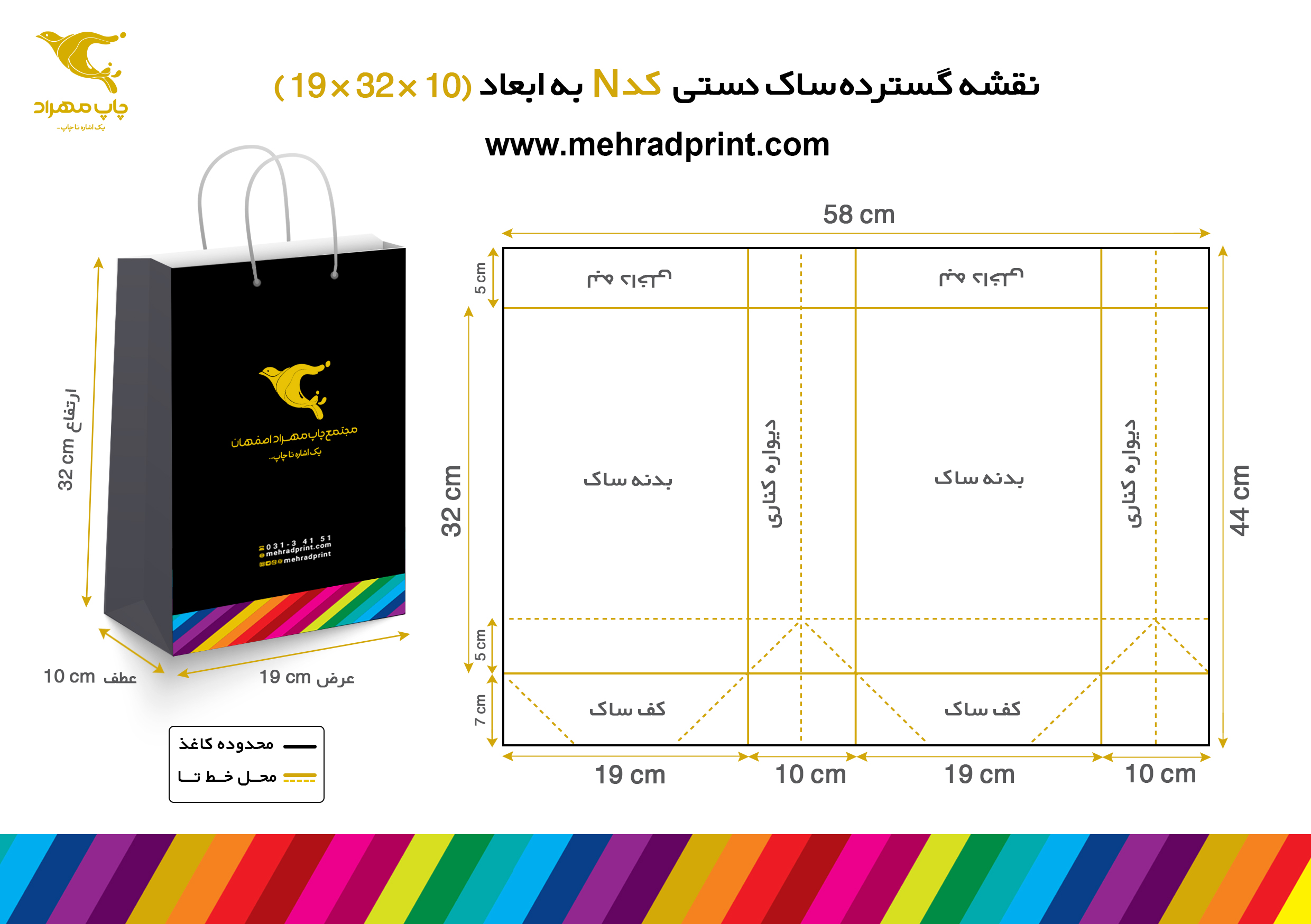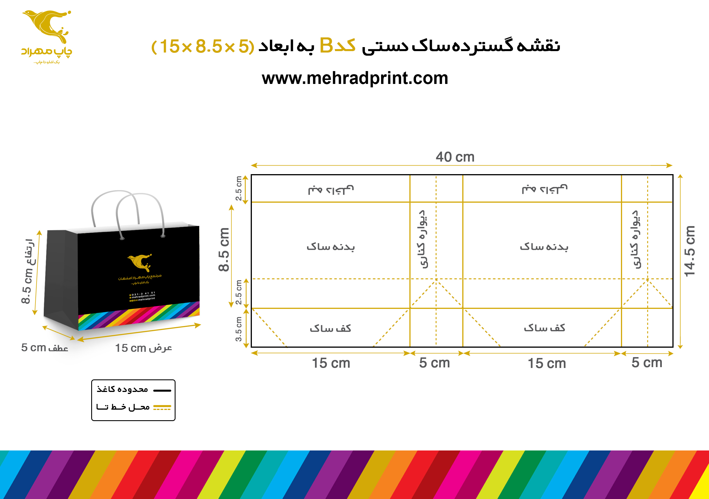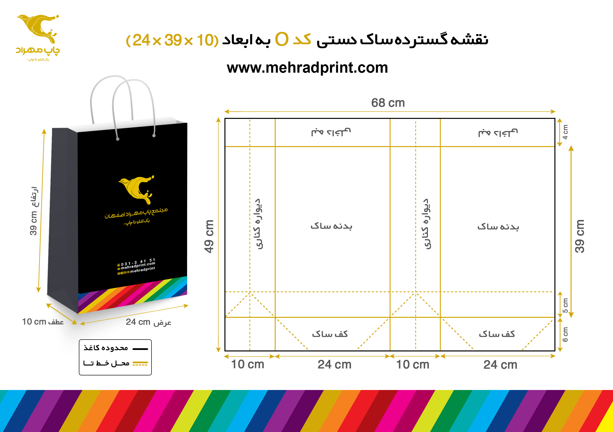 5 - توجه داشته باشید که در رو، پشت و هر دو عطف ساک، به فاصله نصف عطف از کف ساک، یک عدد خط تا زده خواهد شد. پس دقت کنید هیچ نوشته ای مثل آدرس روی این خط تا نوشته نشود. (مثال: در یک ساک 10×39×24 یعنی کد 4 به فاصله نصف عطف یعنی 5 سانتیمتری کف، یک عدد خط تای افقی زده می شود.)