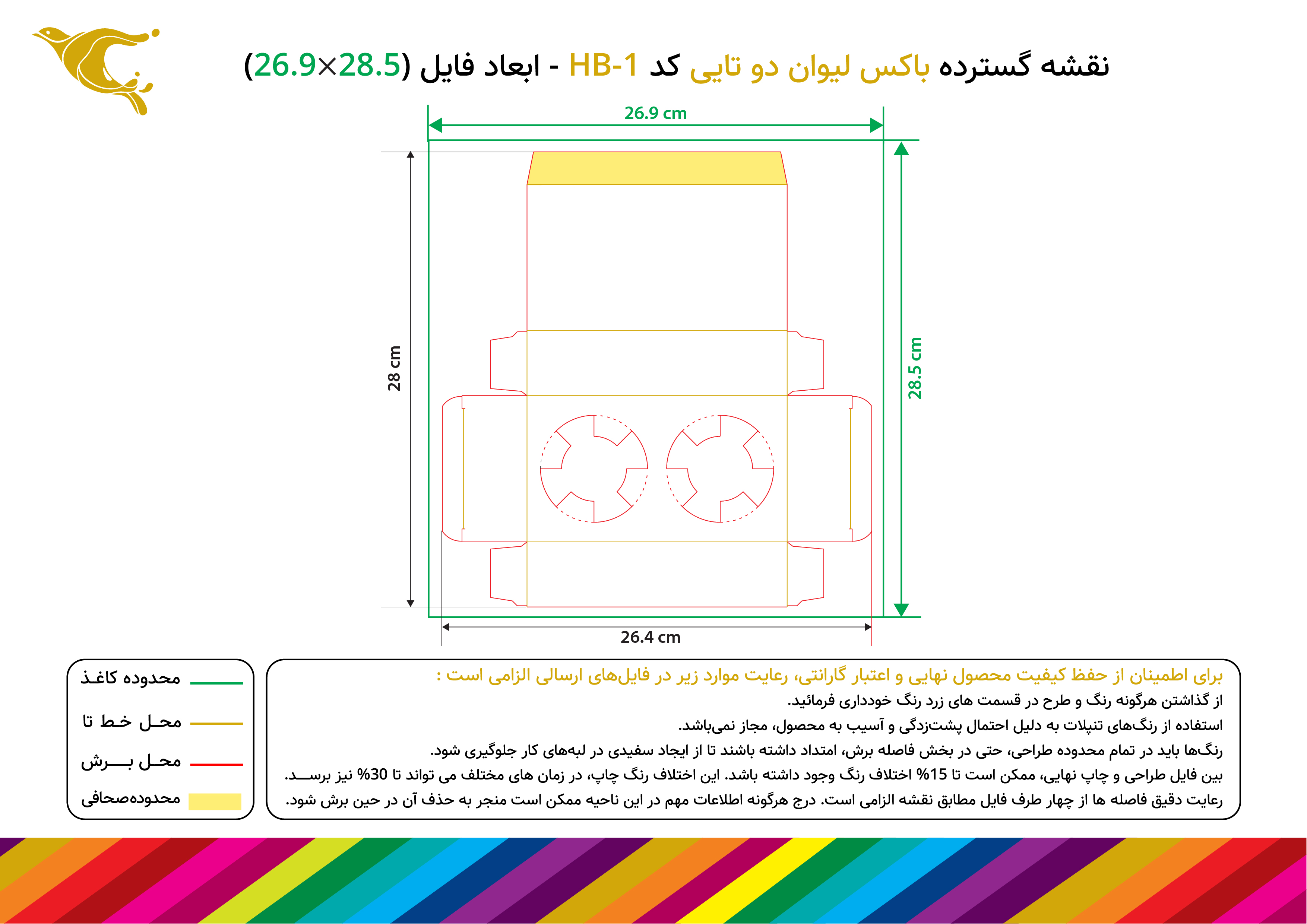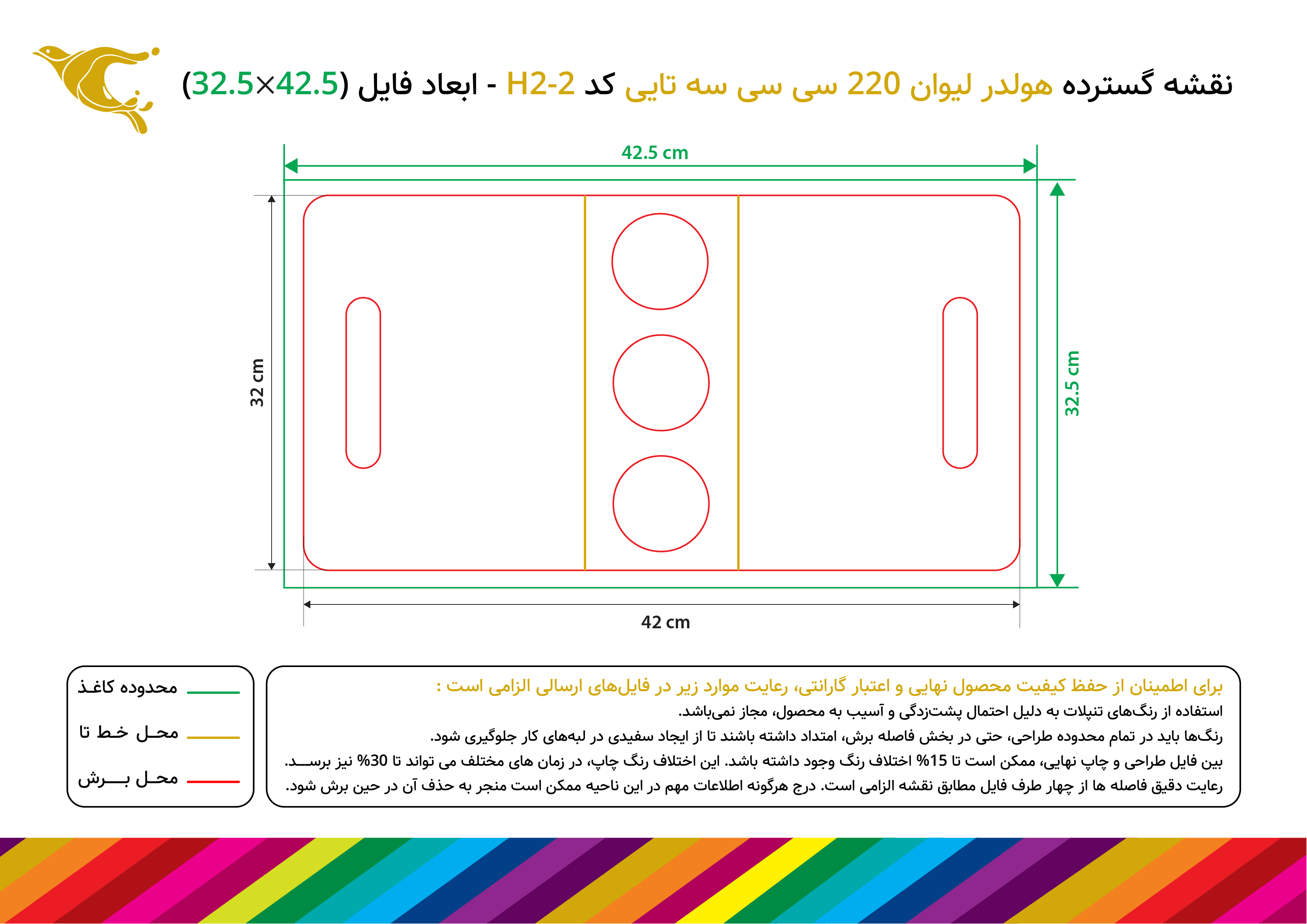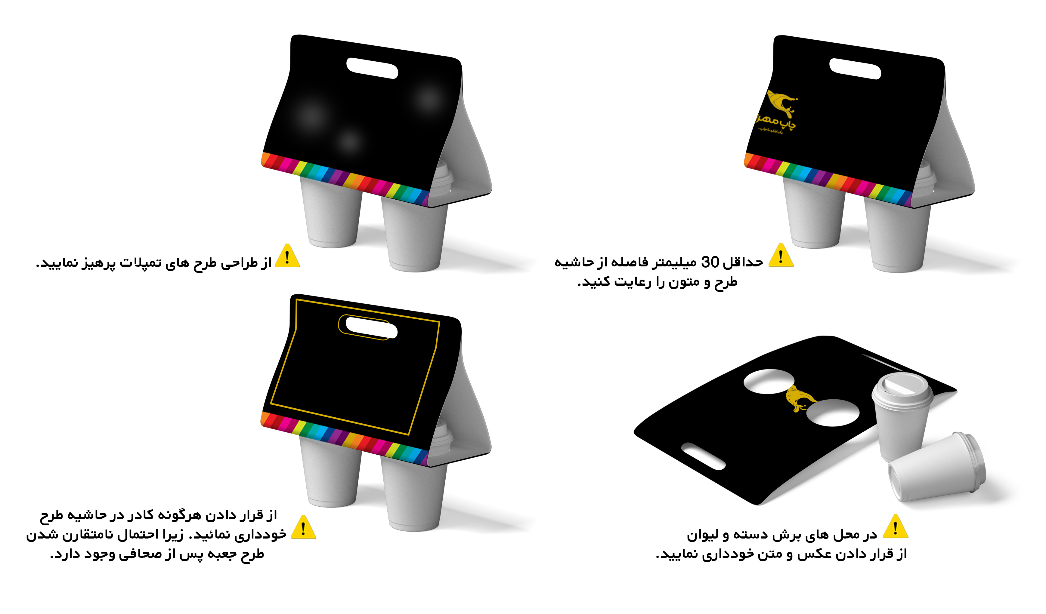 ● برای زیبایی هرچه بیشتر محصول، در هنگام طراحی از قرار دادن متن و نوشته ها در فاصله کمتر از 2 سانتیمتری حاشیه های هولدر و باکس خودداری نمایید.