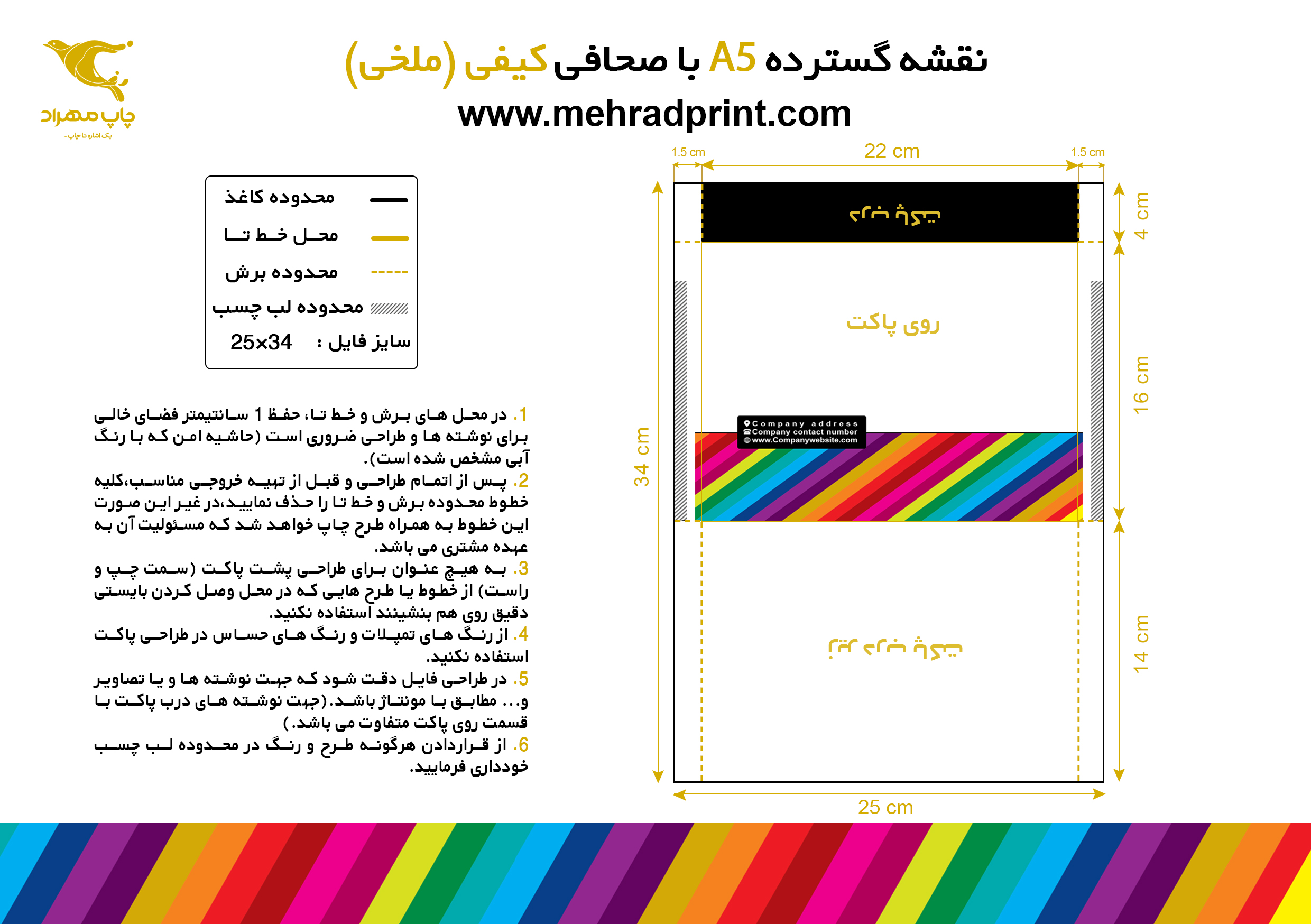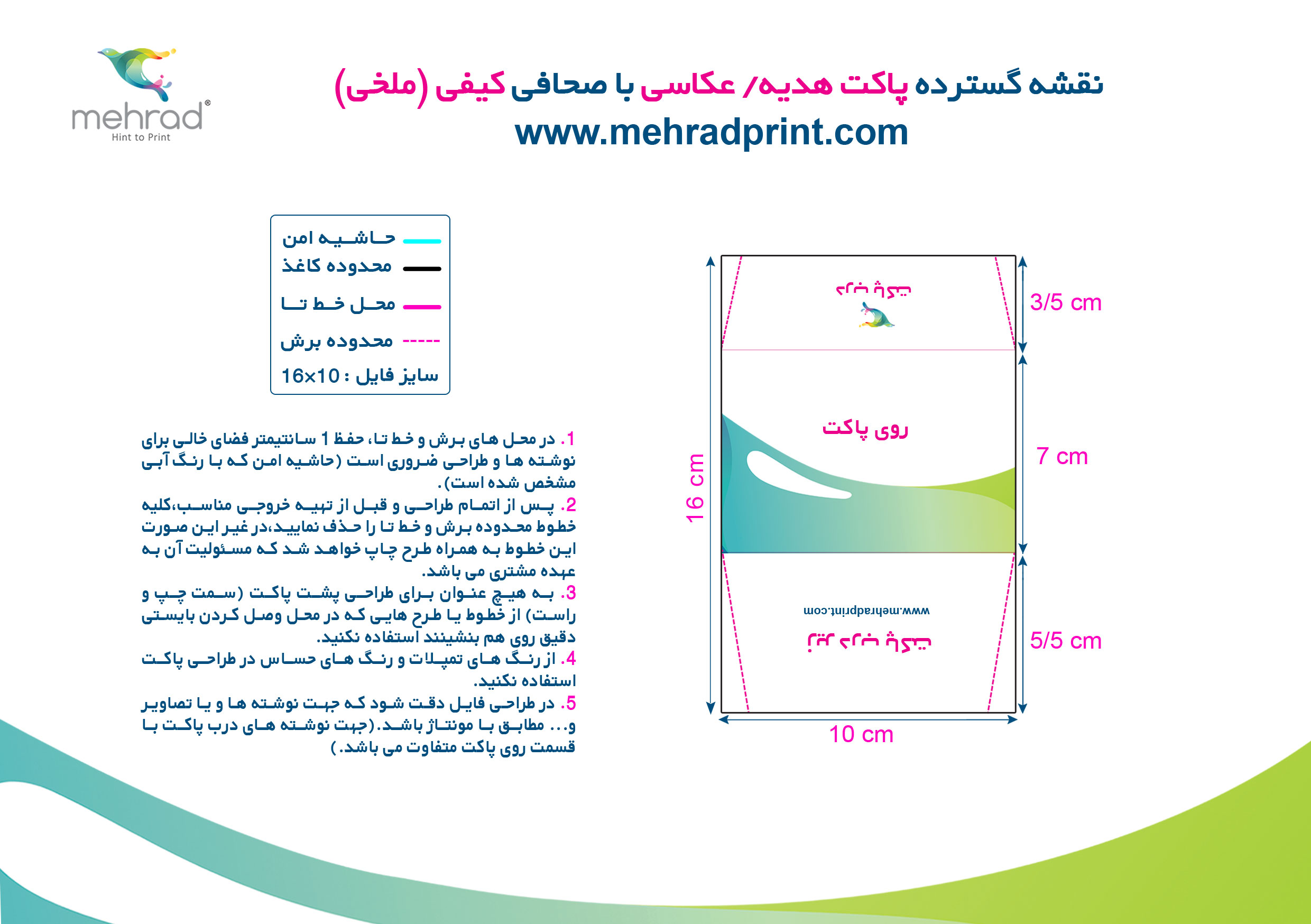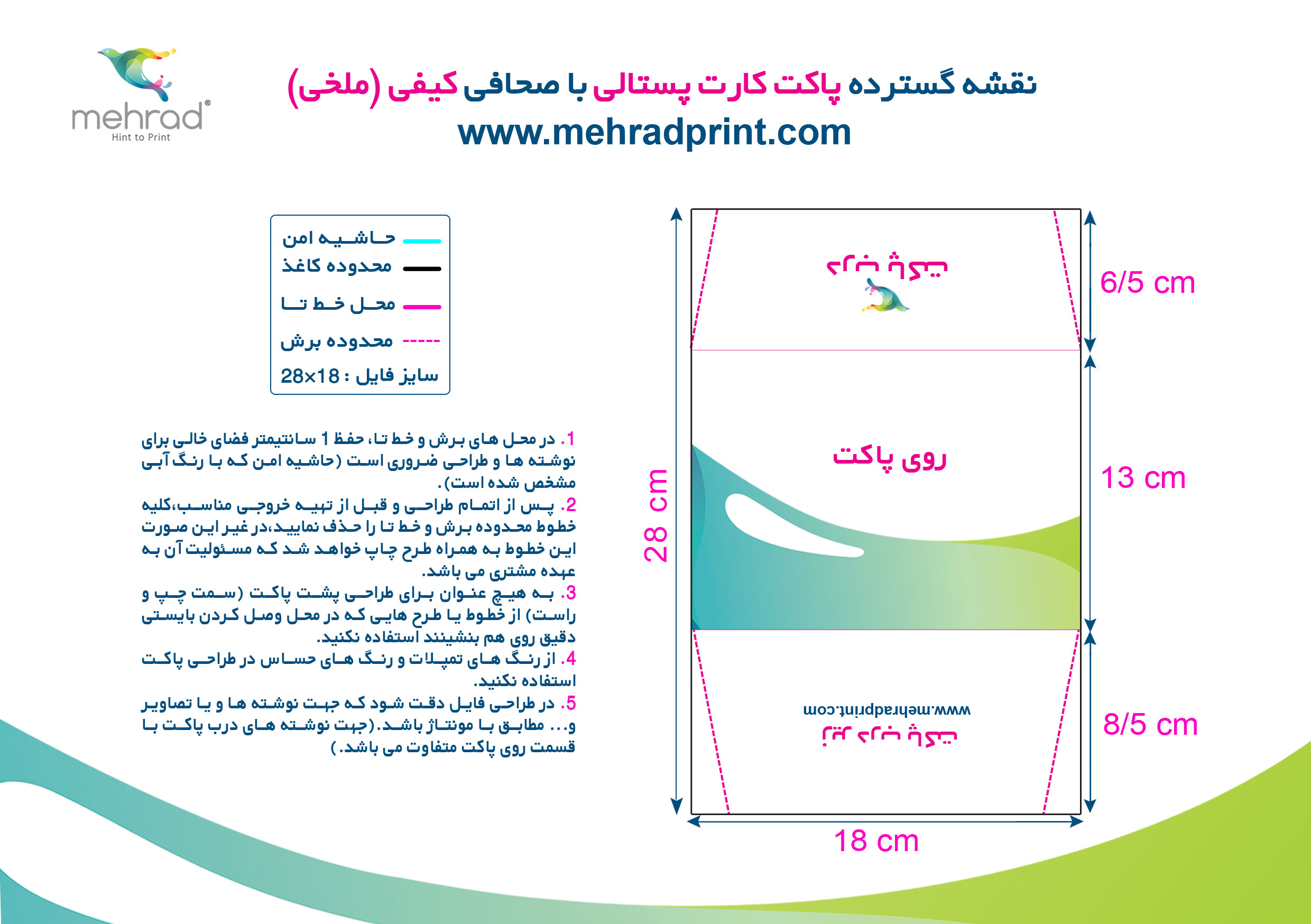 ✅ در محل های برش و خط تا، حفظ 1 سانتیمتر فضای خالی برای نوشته ها و طراحی ضروری است (حاشیه امن که با رنگ آبی مشخص شده است).