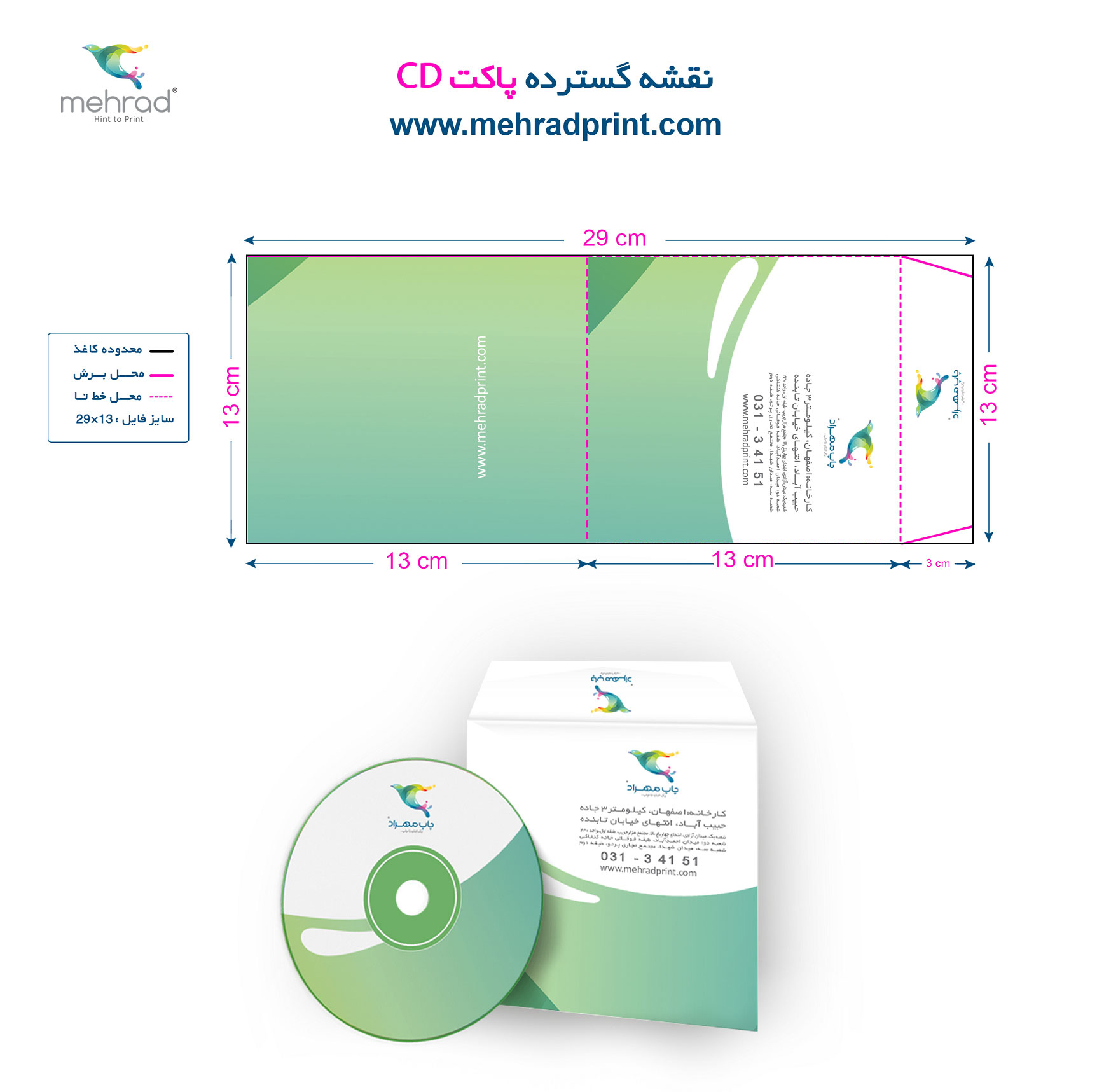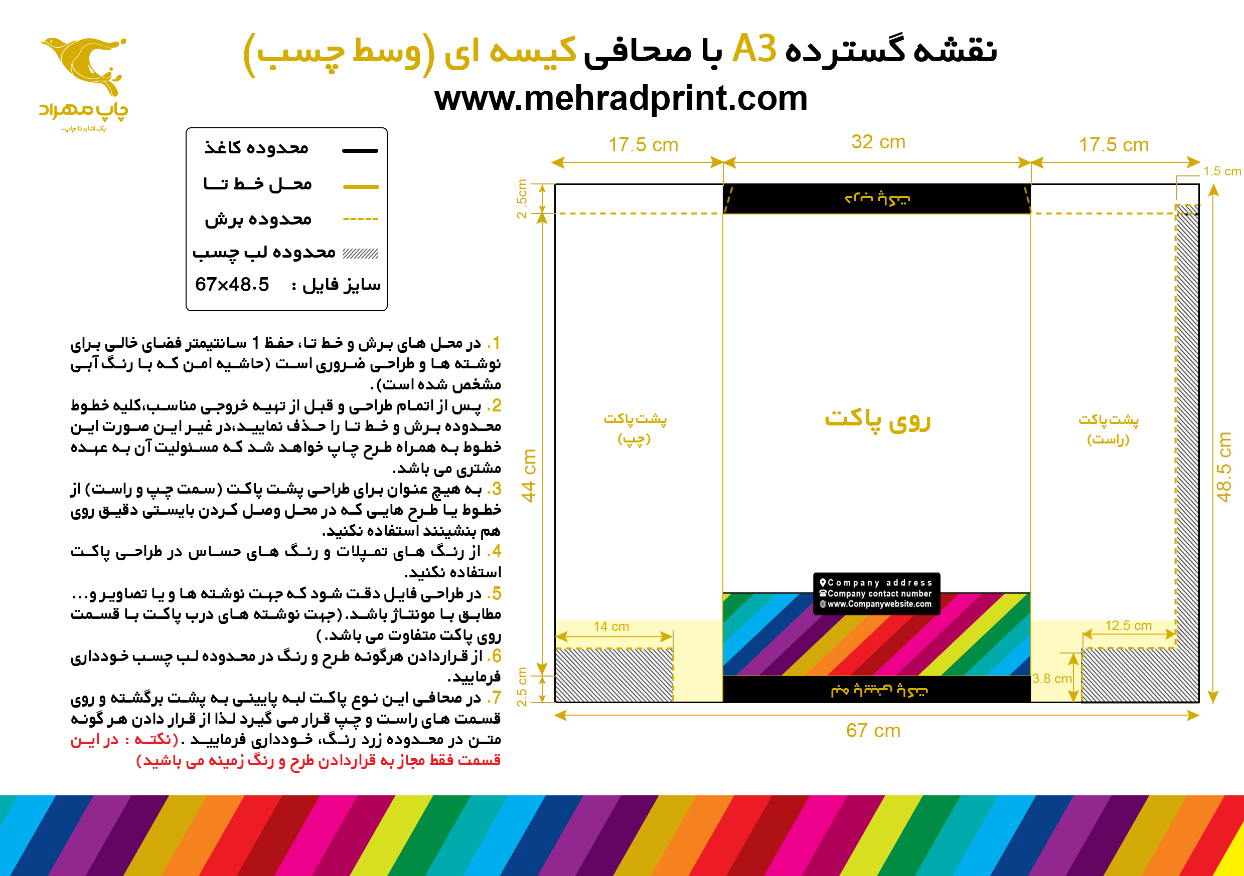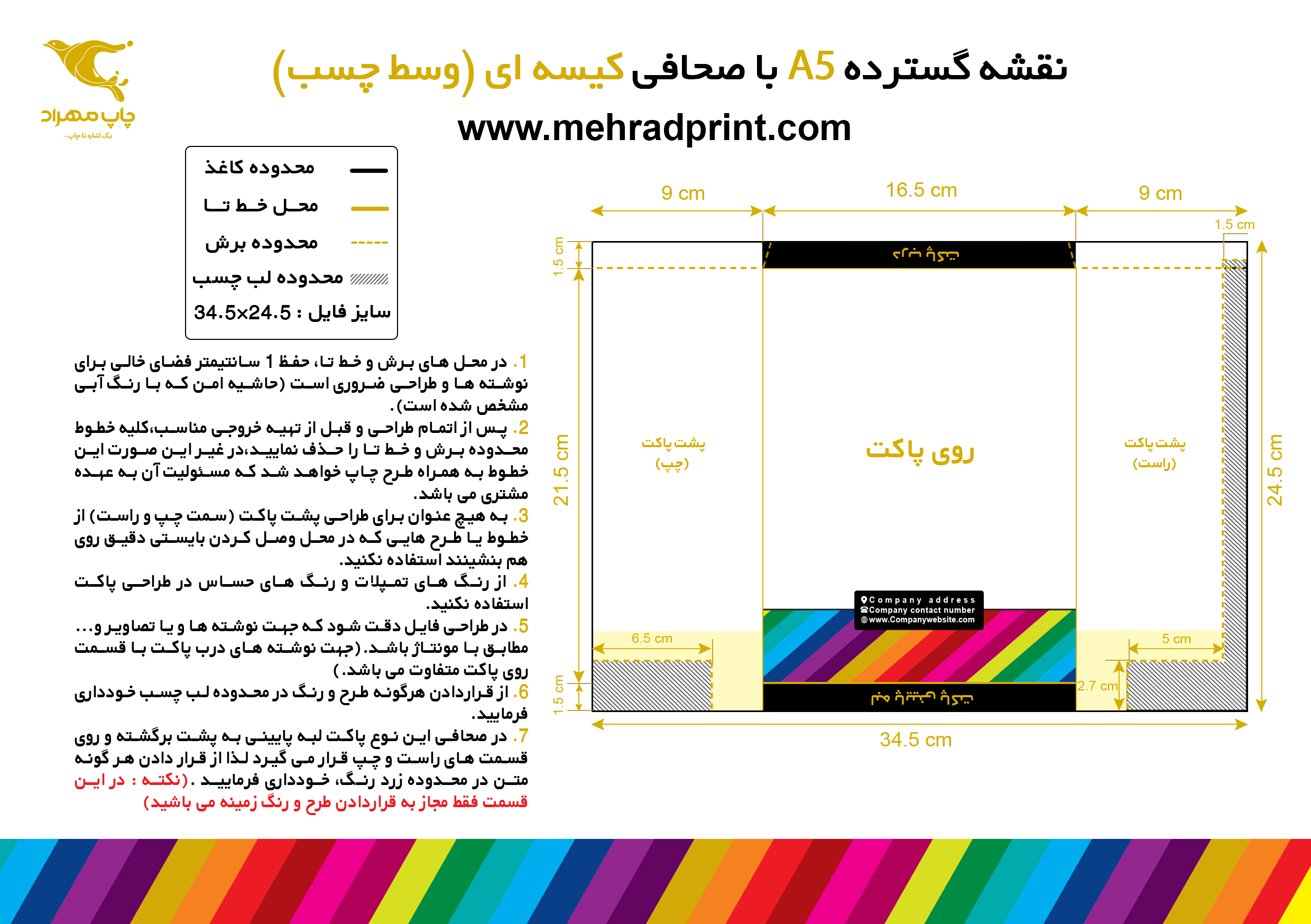 ✅ در محل های برش و خط تا، حفظ 1 سانتیمتر فضای خالی برای نوشته ها و طراحی ضروری است (حاشیه امن که با رنگ آبی مشخص شده است).