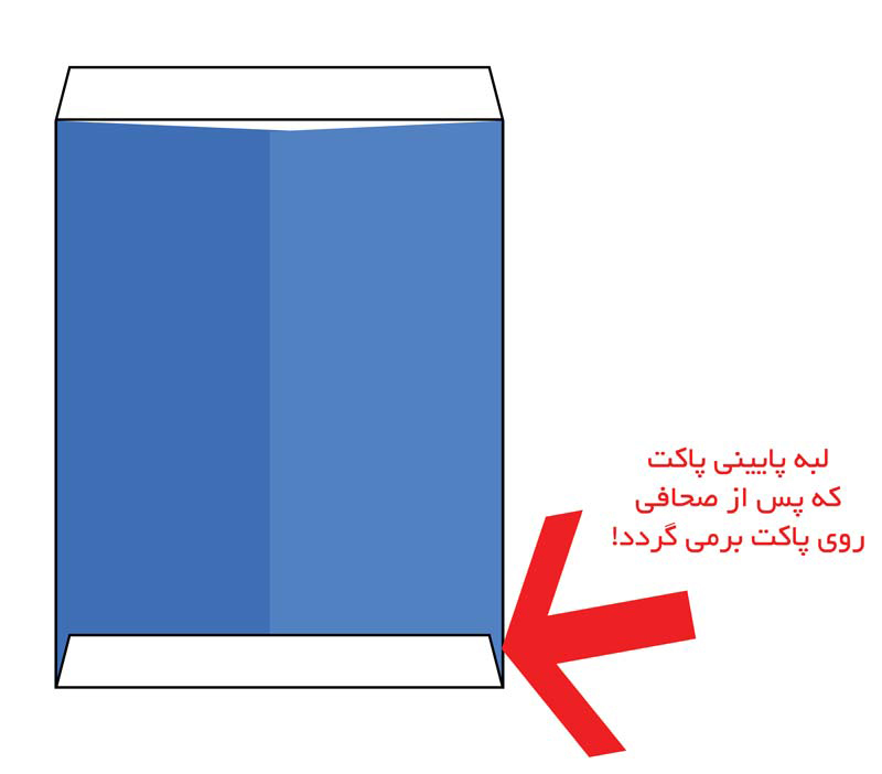 ✅ لبه پایینی پاکت برای صحافی به روی قسمت چاپ شده بر می گردد. بنابراین اگر پشت پاکت چاپ داشته باشد، پس صحافی یک نوار سفید رنگ که در حقیقت همان لبه پایینی پاکت است که برگشته قرار خواهد گرفت. برای مشاهده نمونه و توضیح بهتر اینجا را کلیک کنید.