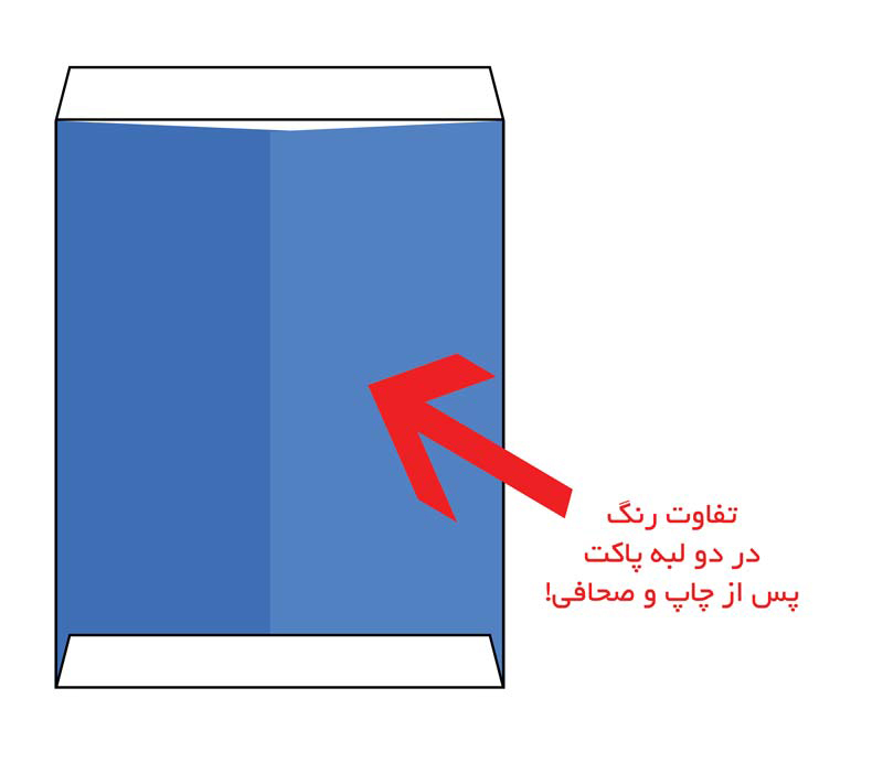 ✅ اگر در پشت چپ و راست پاکت کیسه ای (قسمتی که دو طرف پاکت به هم رسیده و چسبیده شده) از رنگ یکدست استفاده شود احتمال مشاهده شدن تفاوت رنگ مابین این دو پس از صحافی وجود خواهد داشت. برای مشاهده نمونه و توضیح بهتر اینجا را کلیک کنید.
