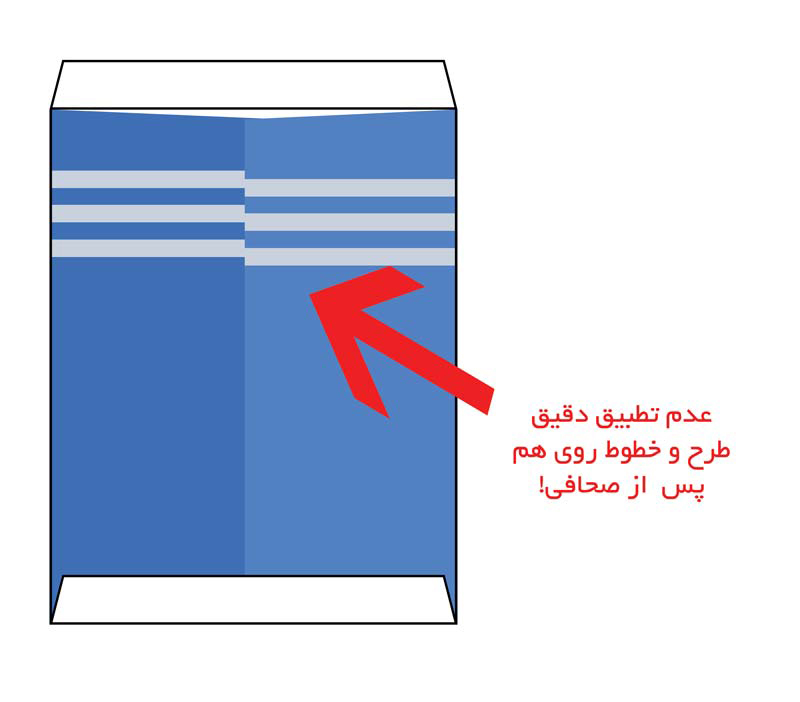 ✅ همچنین اگر درپشت چپ و راست پاکت از طرحی استفاده شود که طوری تنظیم شده تا پس از صحافی روی هم منطبق شود، باید گفت احتمال جابجا شدن و عدم انطباق طرح پس از صحافی بسیار زیاد است. برای مشاهده نمونه و توضیح بهتر اینجا را کلیک کنید.
